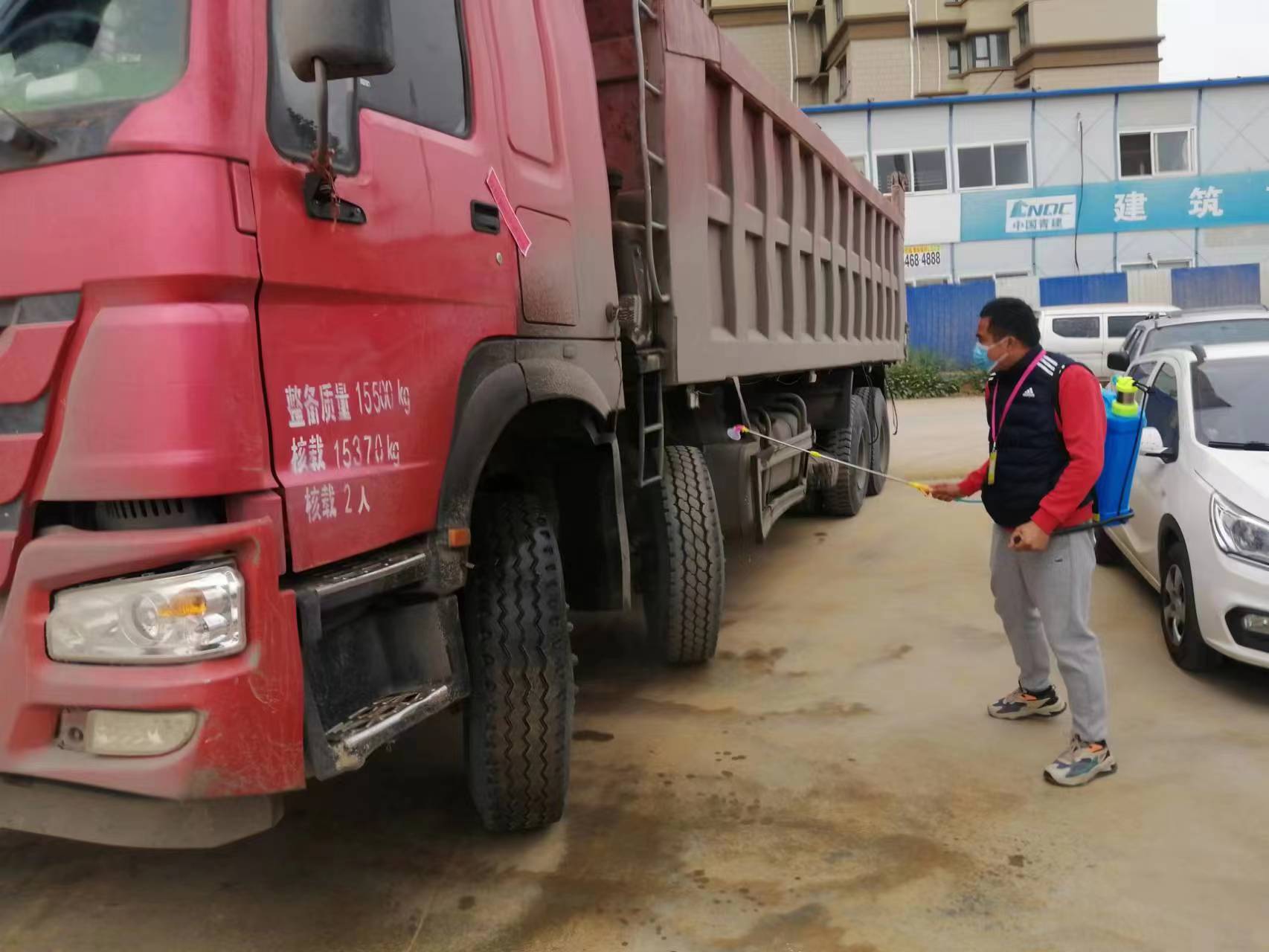 現(xiàn)場實行分區(qū)管理。在施工區(qū)和生活區(qū)管理人員和建筑工人全部進行封閉化管理,不允許外來人員進入。工地設置了材料進場專用過渡區(qū),對材料進行防疫消殺后才能進入現(xiàn)場使用。運輸車輛進入現(xiàn)場作業(yè),首先要進行必要的信息查驗登記,在車門貼上封條,對車體消殺之后,方可進入現(xiàn)場施工。駕駛員全程不下車,按照“即停即卸即裝即走”原則,不得與工地人員直接接觸,減少傳染風險。